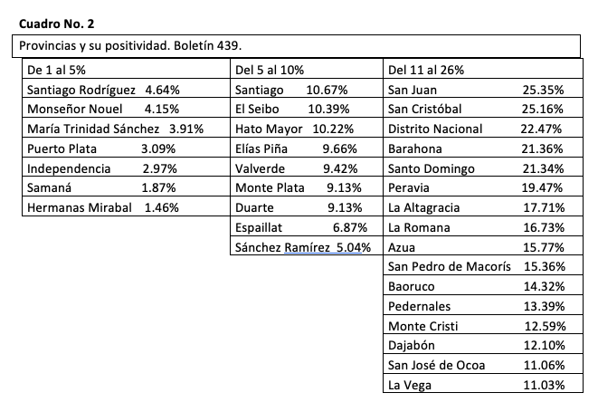 Pero si andamos muy mal en la tasa de positividad general y por día, lo triste de esta pandemia es el comportamiento del virus en las 31provincias y el distrito nacional, el cual, el cuadro No. 2 lo evidencia.