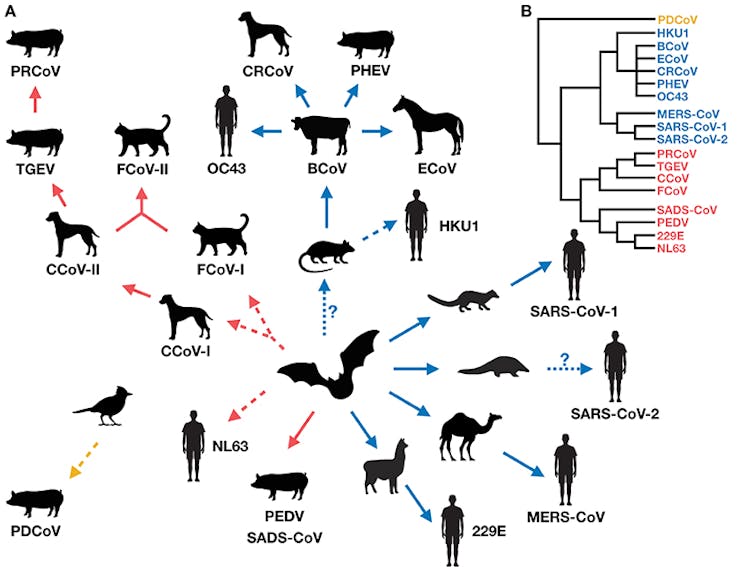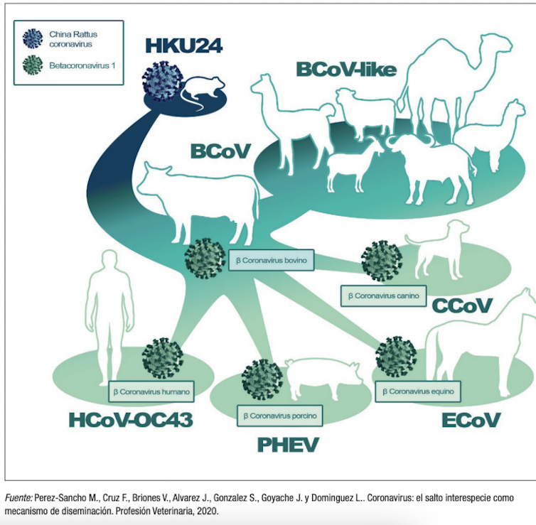 Los coronavirus llevan saltando de unos animales a otros desde hace miles de años. También de animales al ser humano. El HCoV-OC43 humano y el BCoV bovino son muy similares y tienen muchas similitudes a nivel antigénico y genético. El BCoV causa diarreas severas en bovinos recién nacidos. Virus similares al BCoV se han aislado también en otros rumiantes silvestres, en perros y gatos e incluso en aves.